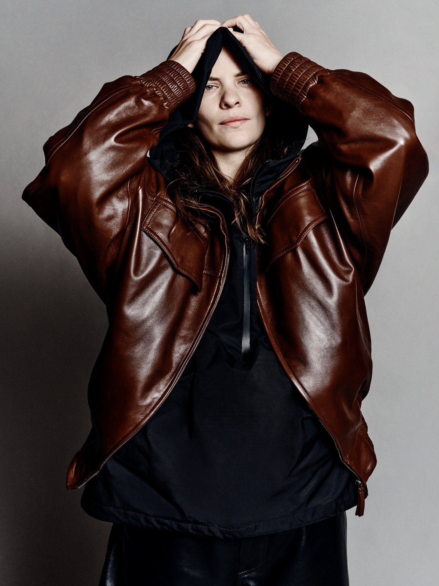 The palette leans into classic neutrals — blacks, greys, and muted tones — punctuated by richer hues introduced through texture rather than print. Performance fabrics play alongside traditional wool and leather, reinforcing the collection’s hybrid character: technical yet refined, functional yet considered.