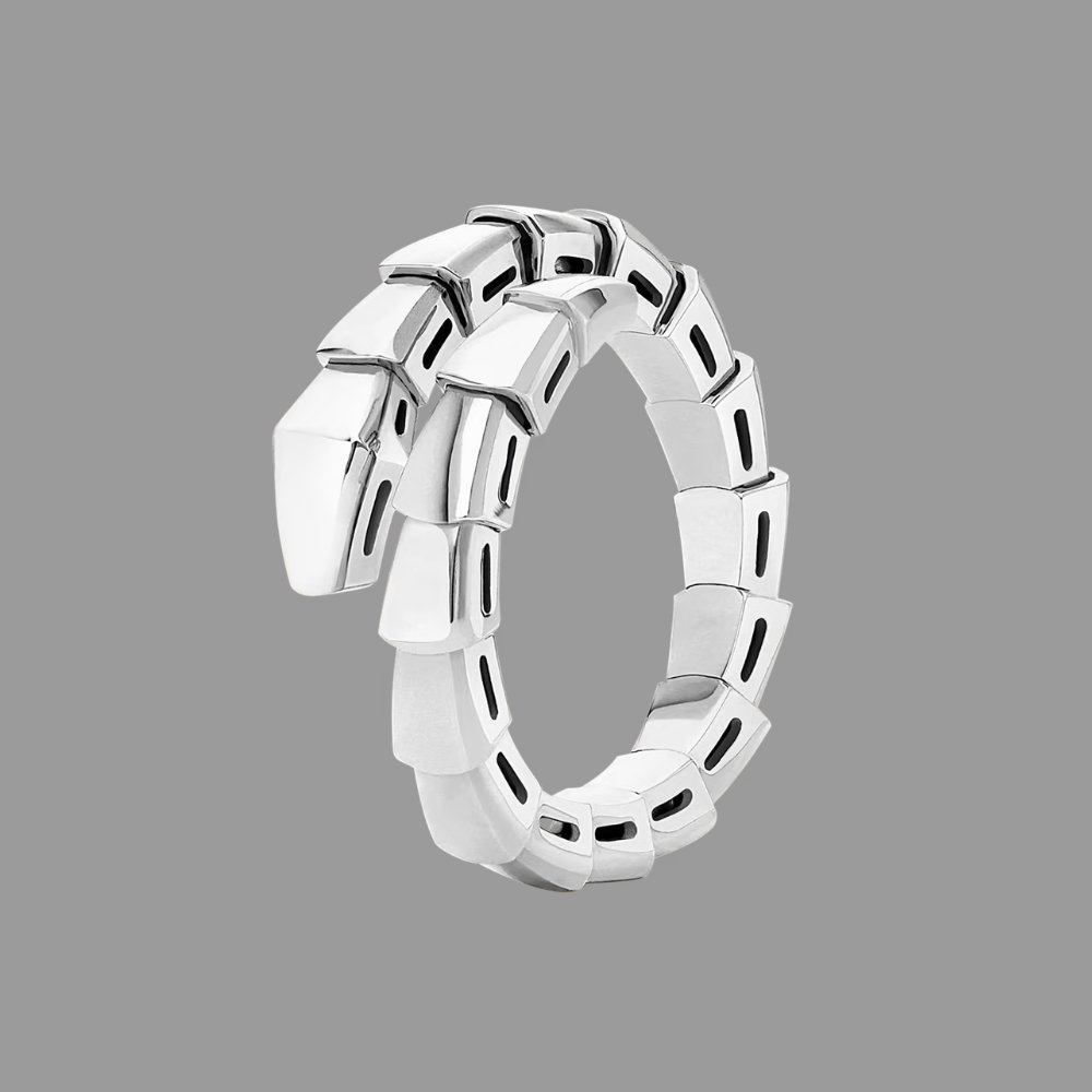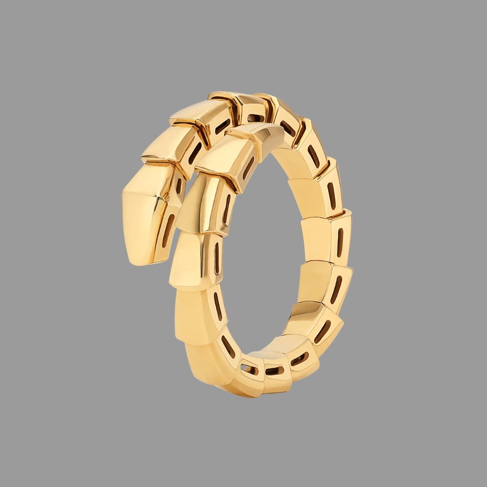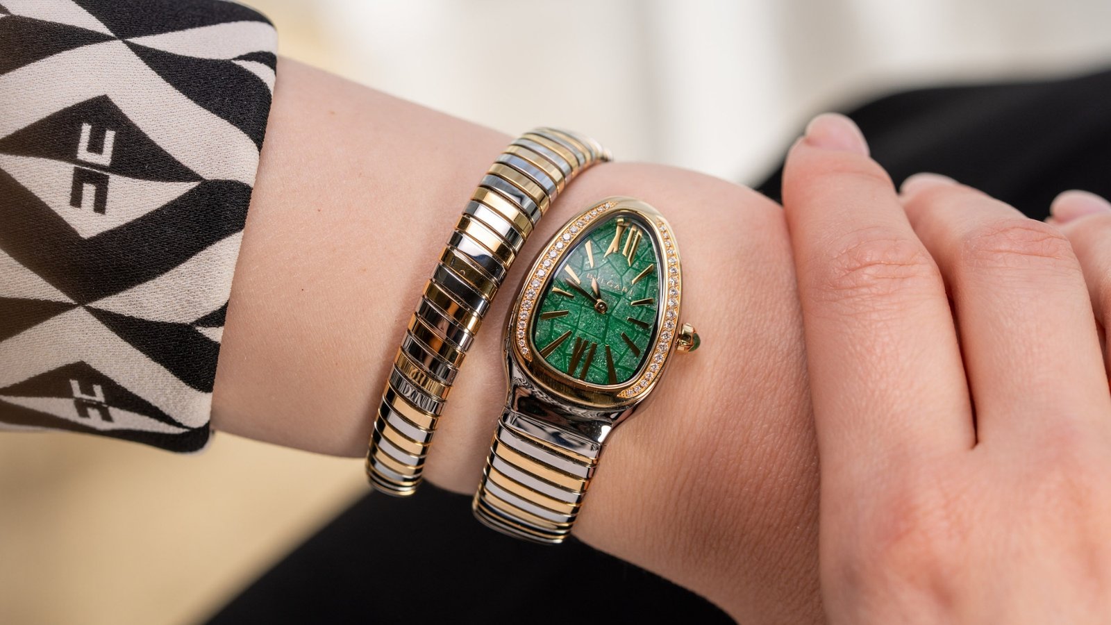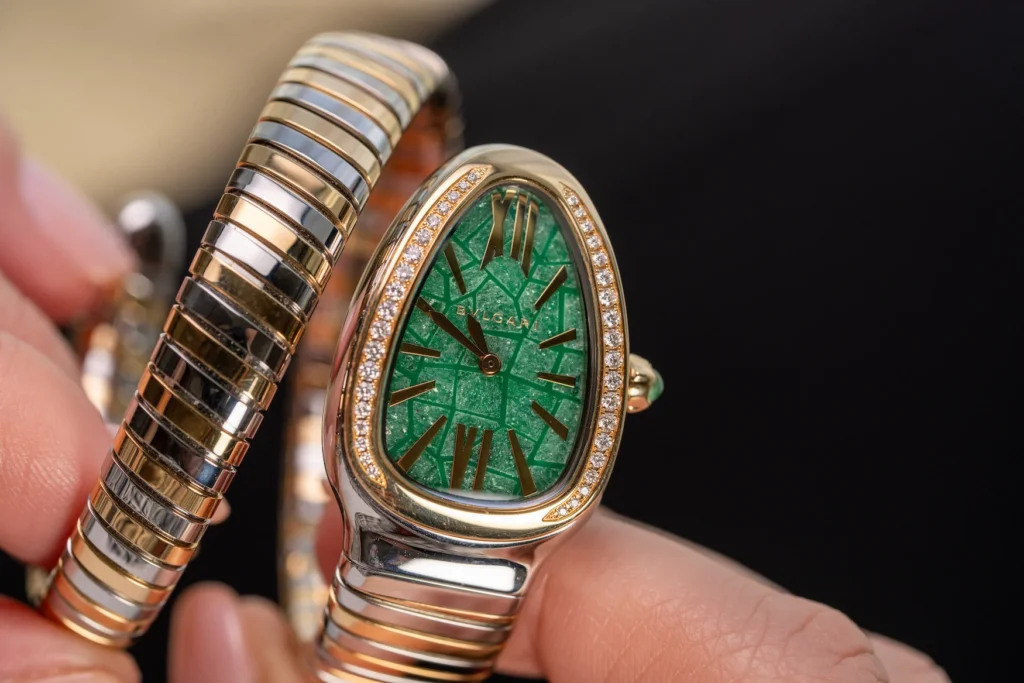 Rather than representing a literal snake, Bulgari interprets the motif through stylized geometry and elegant curves.