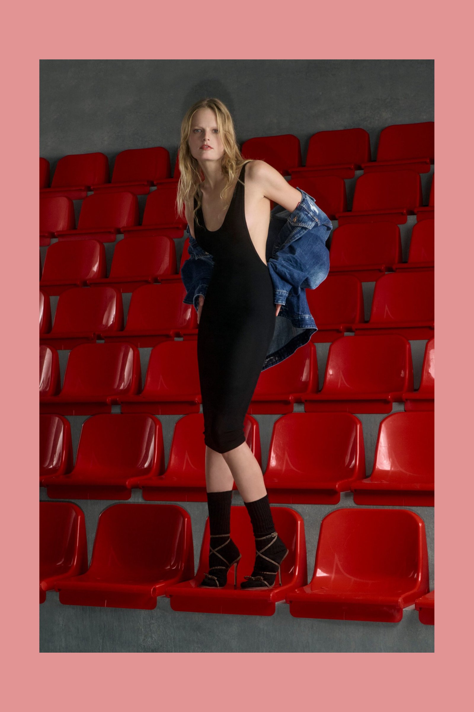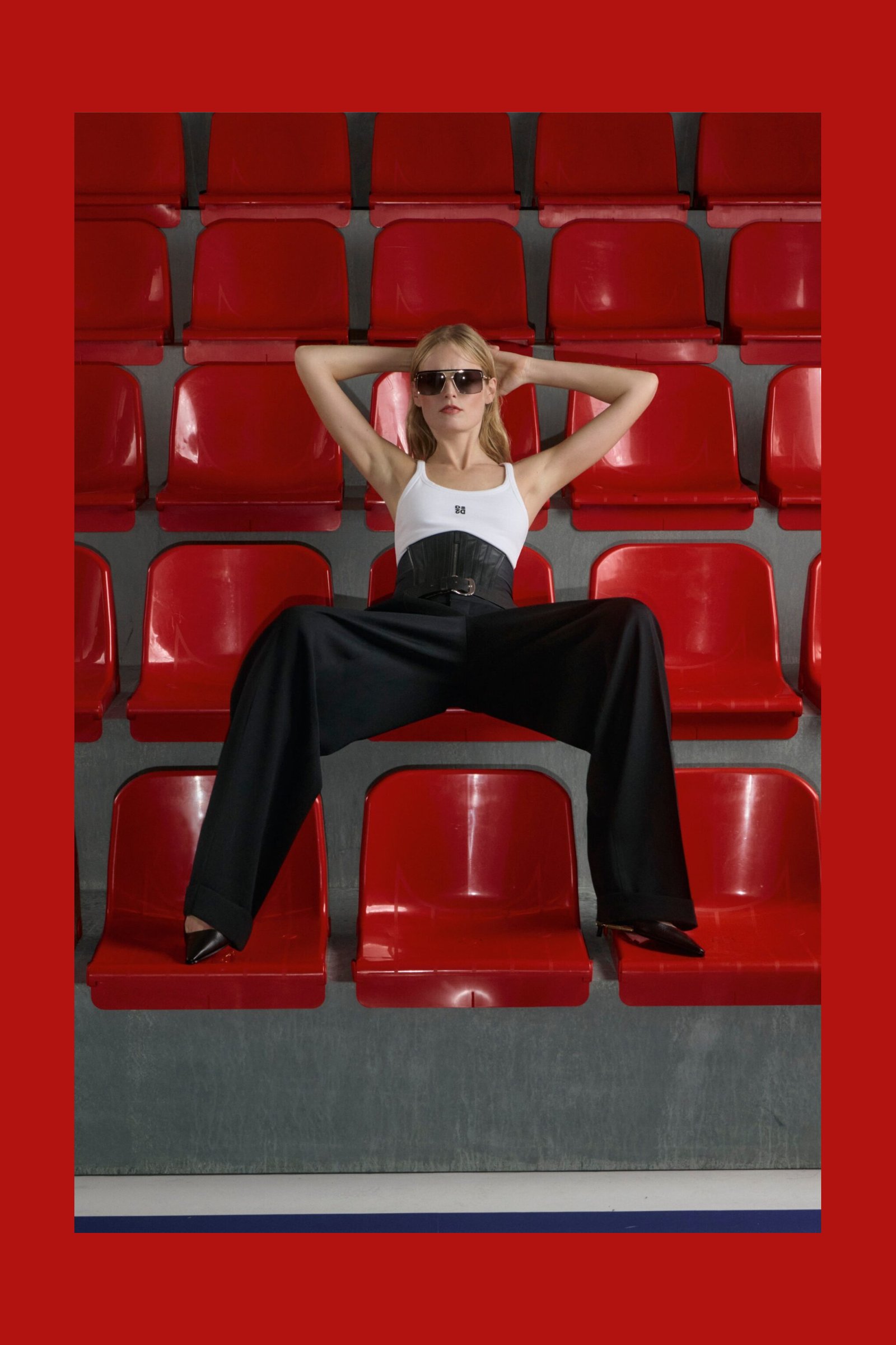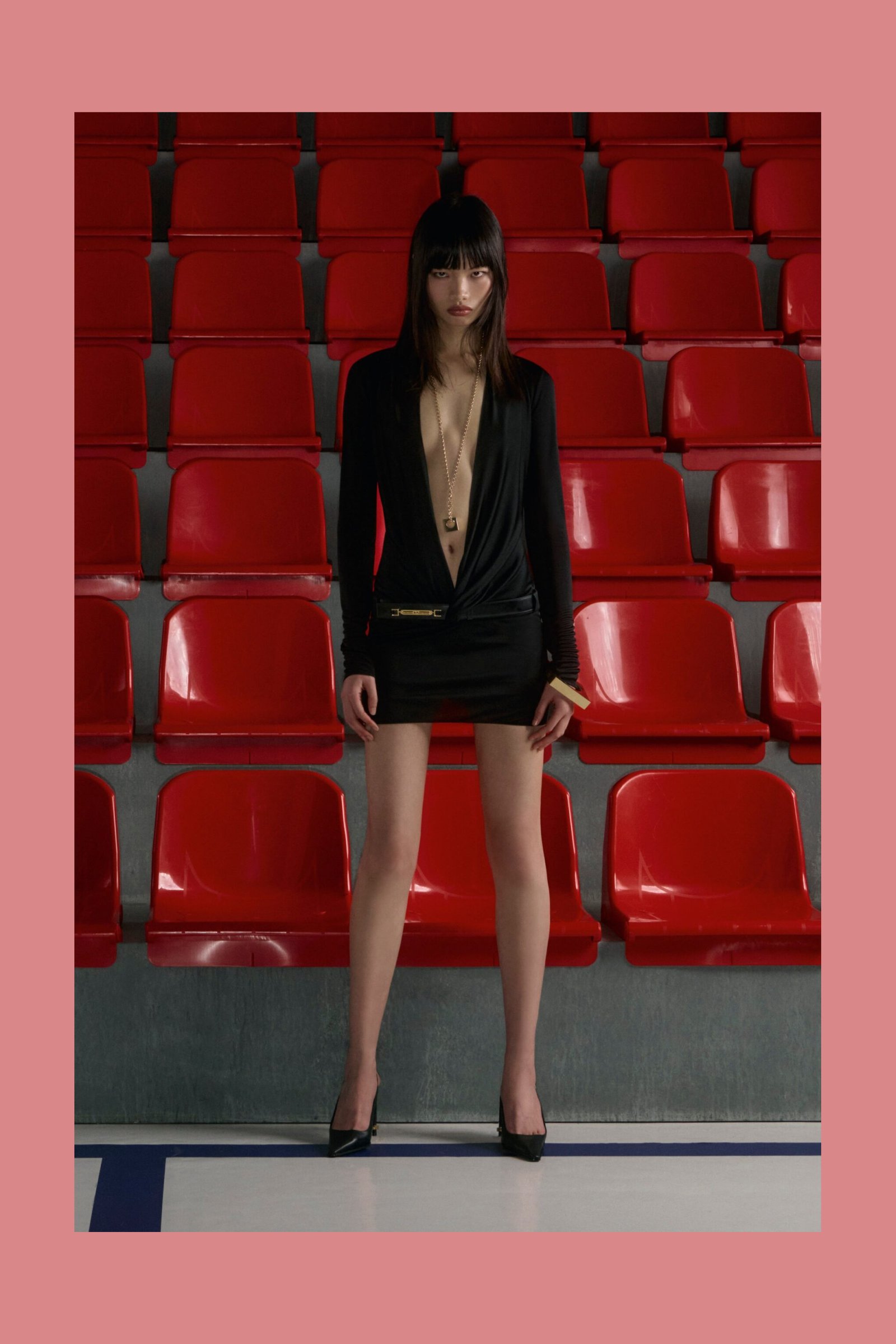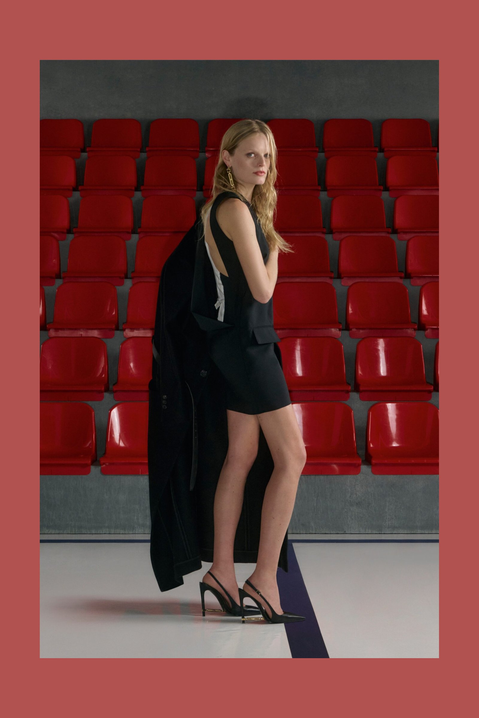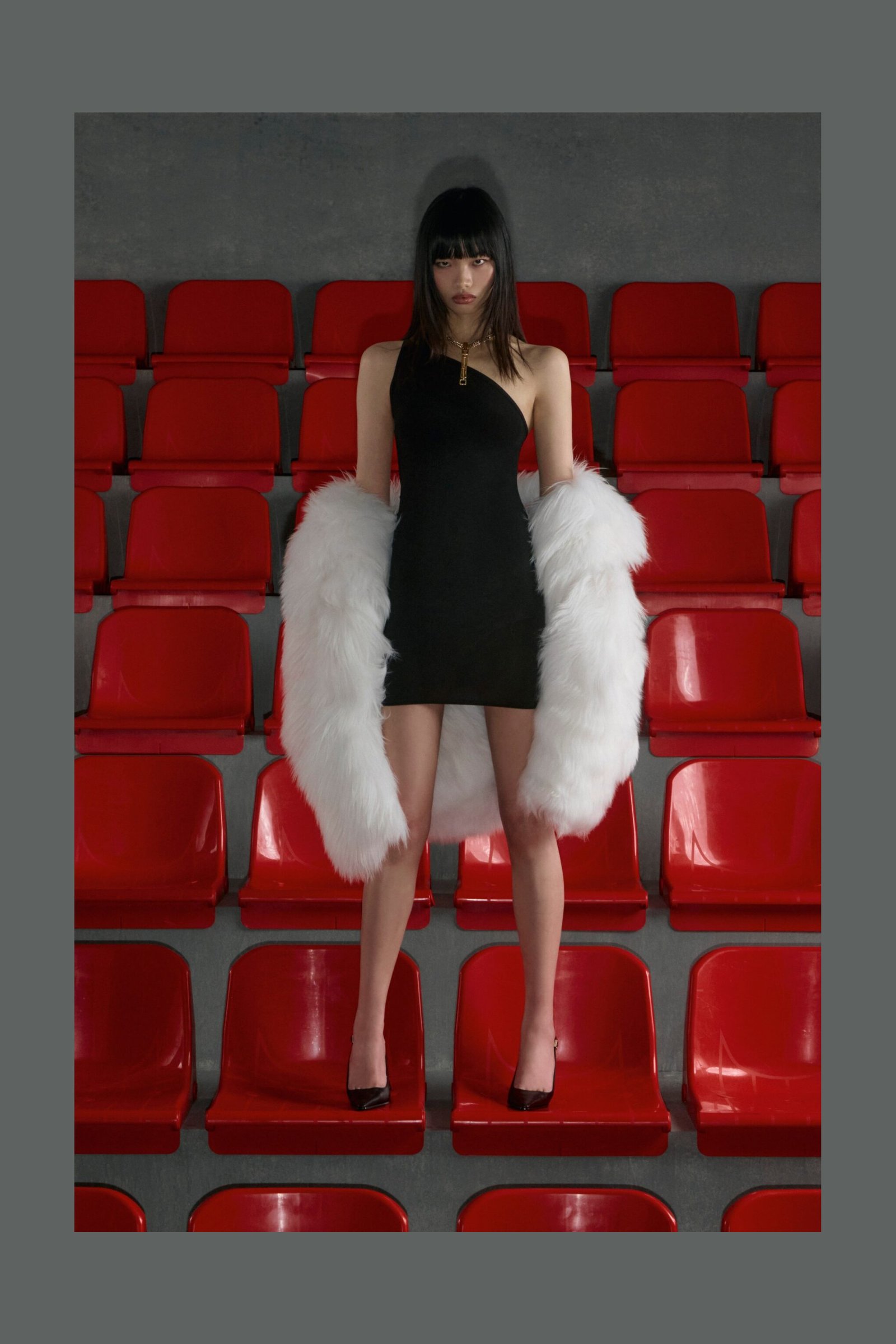 The colour palette favours classic glamour codes — black, deep neutrals, and high-impact tones — while materials do the heavy lifting. Leather, structured fabrics, and tactile finishes dominate, reinforcing the collection’s sensual, nightlife-driven character.