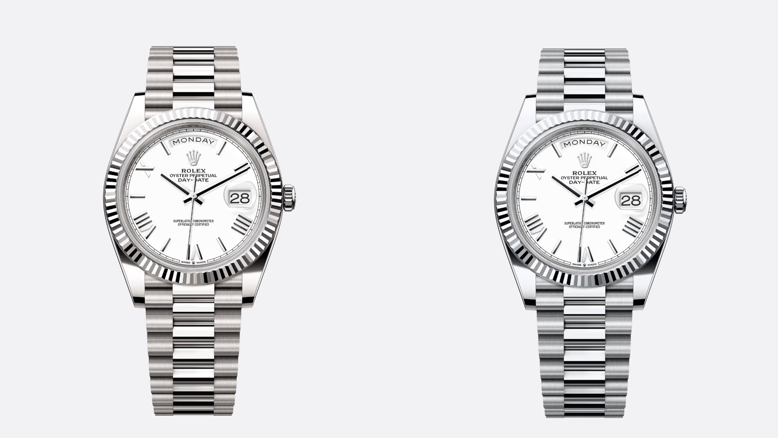 - A similar Rolex Day-Date in platinum. Both share design DNA, case dimensions, and high-end finishing.